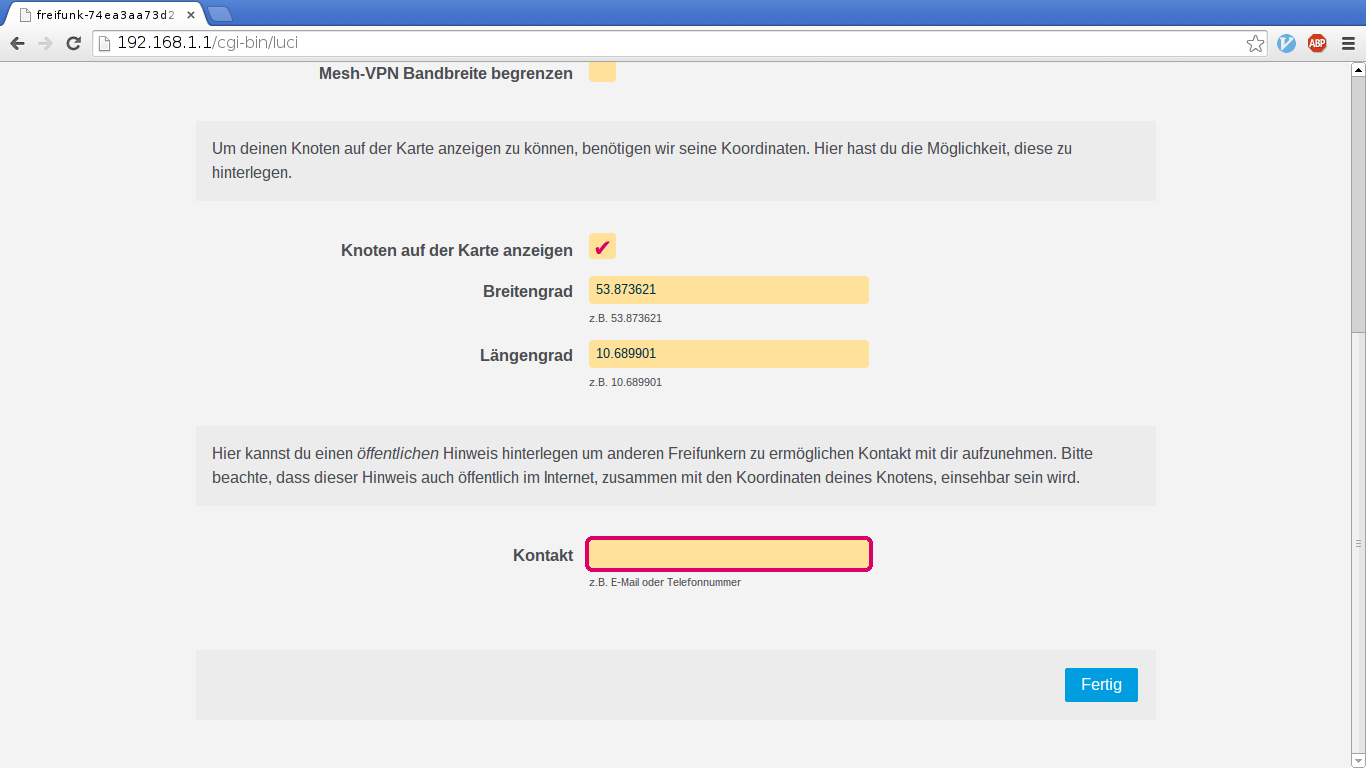 Wenn du möchtest, dass du und andere Mitmenschen den Standort deines Knotens in der Freifunk-Karte sehen können, dann musst du hier ein Häkchen setzen und die rot unterlegten Felder ausfüllen. Die Werte dazu kannst zum Beispiel mit Hilfe des Stecknadel-Knopfes in der angesprochenen Karte ermitteln. Außerdem gibt es inzwischen noch ein Feld für die Höhe in Metern über dem Boden. Schätze diesen Wert einfach indem du 3 Meter pro Stockwerk rechnest.